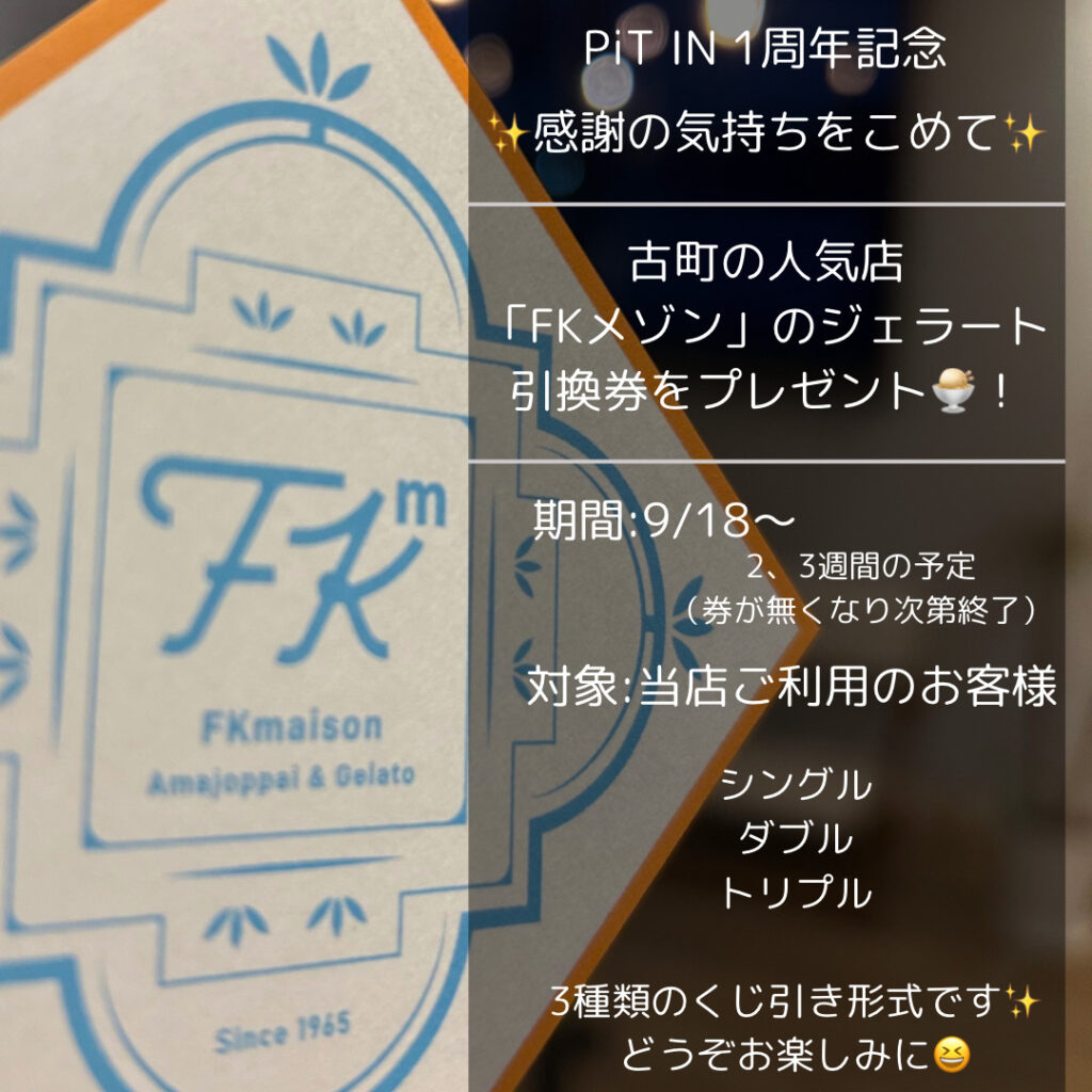期間中当店をご利用のお客様に、古町のジェラートとスティックパイで人気のお店「FKメゾン」のジェラート引換券をなんと、